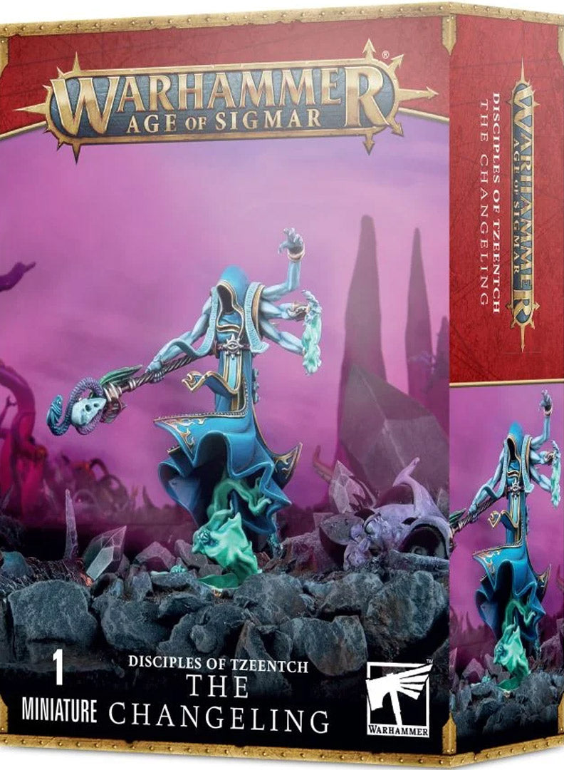 This multi-part plastic kit contains the parts necessary to assemble a Changeling. Armed with the Trickster’s staff in one arm, with its sinister snake on the end, his other 3 arms are all concentrated on his left side, and are preparing to blast warpfire at an unfortunate foe. Clad in a cloak carrying 3 mysterious scrolls, with a huge hood obscuring his face and hiding his identity, he stands aloft magical flames which elevate him from his base.