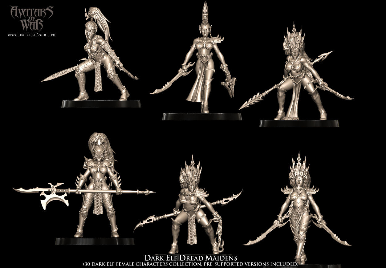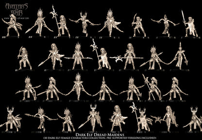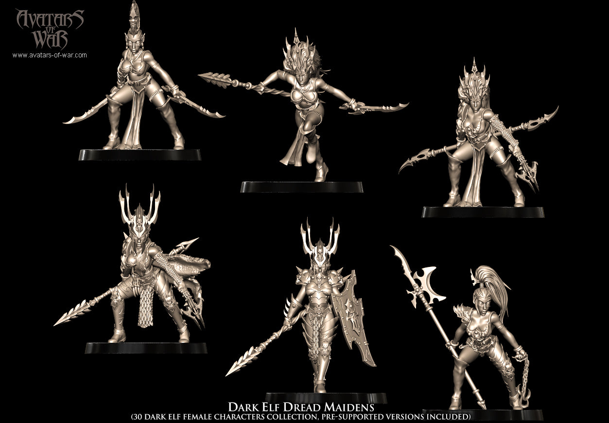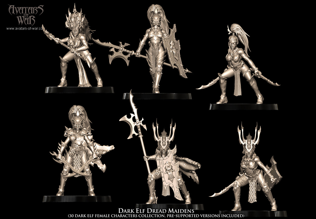 Driven by cruelty and a thirst for power are the Dark Elf Dread Maidens! Pain and suffering is all that awaits those who stand against them. The Dread Maidens make for a terrifying foe, moreso if they decide to leave you alive! These models are a part of the Dark Elf set and make an excellent addition to any Dark Elf force. The original design was made by Avatars of War and printed with resin by us here at Miniature Horde.