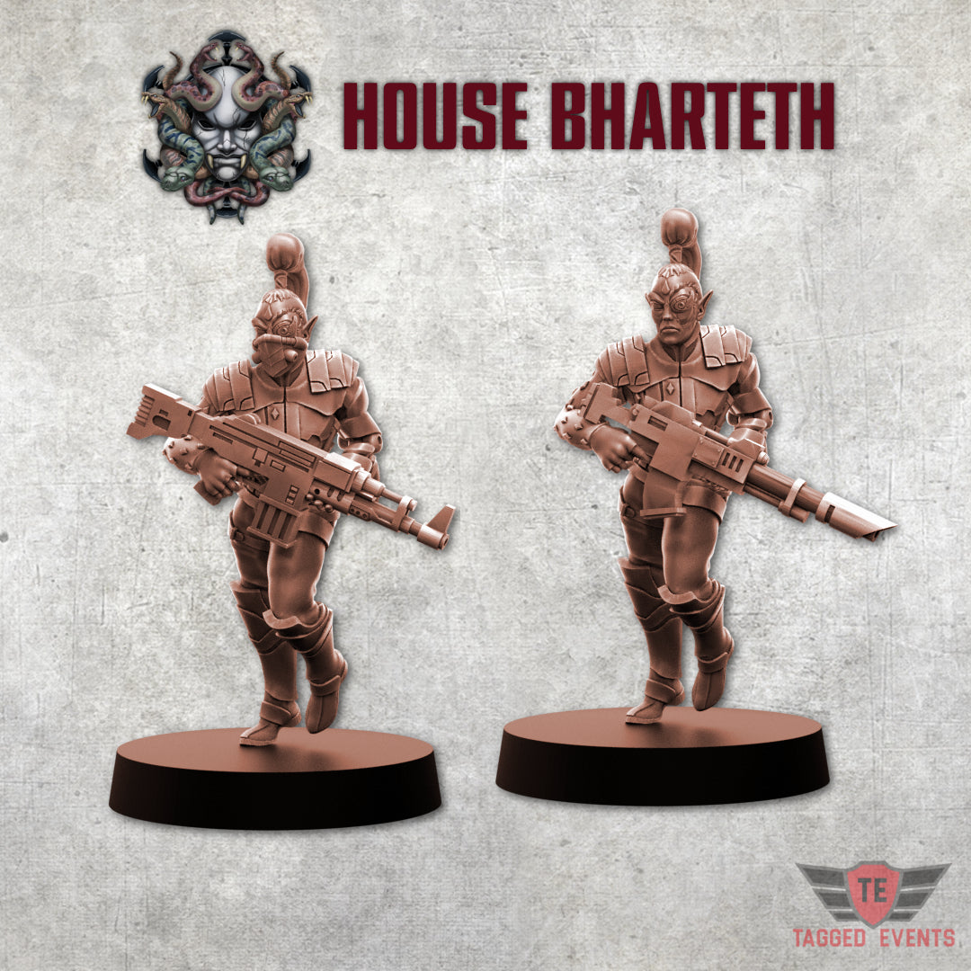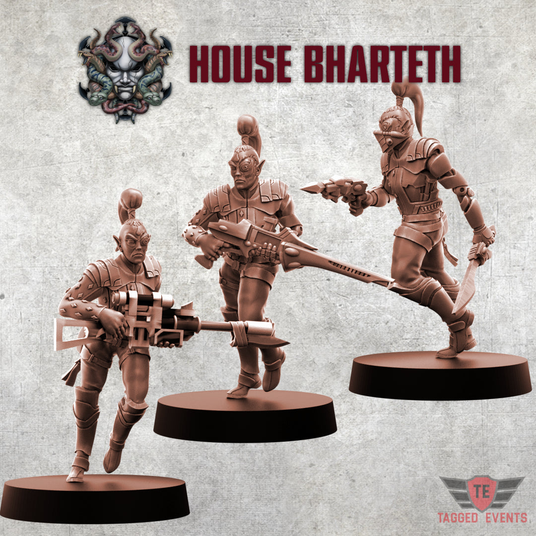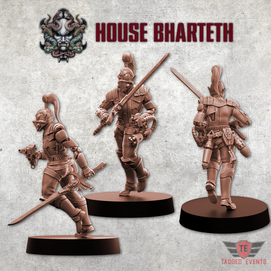 These models are a part of the House Bharteth set. The original model was designed by Tagged Events and printed with resin by us here at Miniature Horde.
