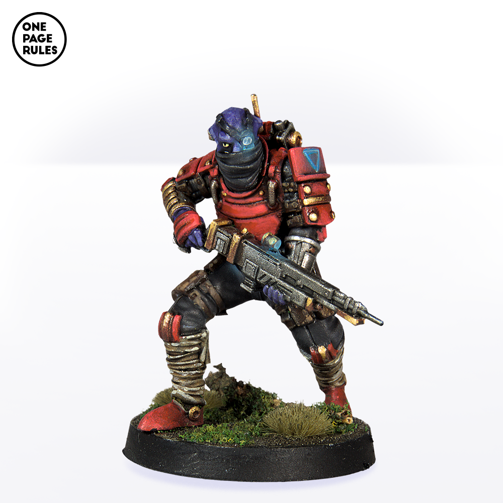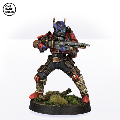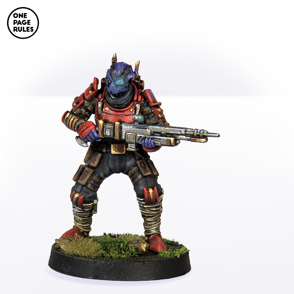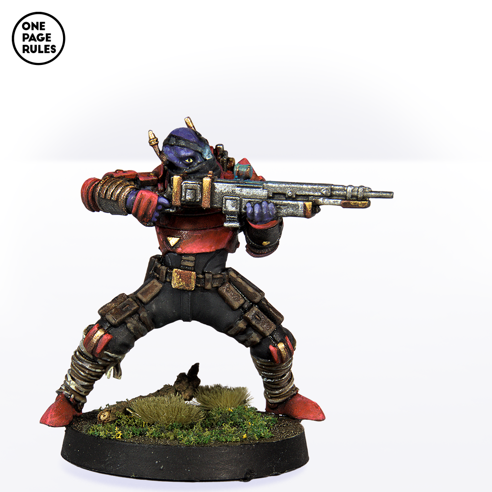 The original model was made by One Page Rules and printed with resin by us here at Miniature Horde. This model was designed to be used in the game Grimdark Future Which rules are available in thier Starter Sets, and the Army Forge where the rules for every army is availbale for Free